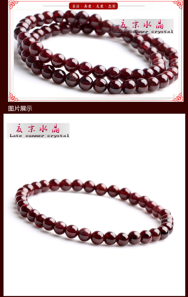 Браслет из граната способствует циркуляции крови, повышает жизненную силу и может играть роль в красоте. Он имеет название «beauty stone» и является выбором ювелирных изделий для женщин. Гранат считается символом веры, твердости и простоты. Люди готовы владеть, носить и поклоняться им не только из-за его эстетической декоративной ценности, но и, что более важно, люди верят, что драгоценные камни обладают невероятной магической силой, что заставляет людей поддаться обидам, смерти, вечным почестям и статусу. И имеет важную памятную функцию. Красный Гранат подходит для людей с более слабым телом для восполнения энергии.