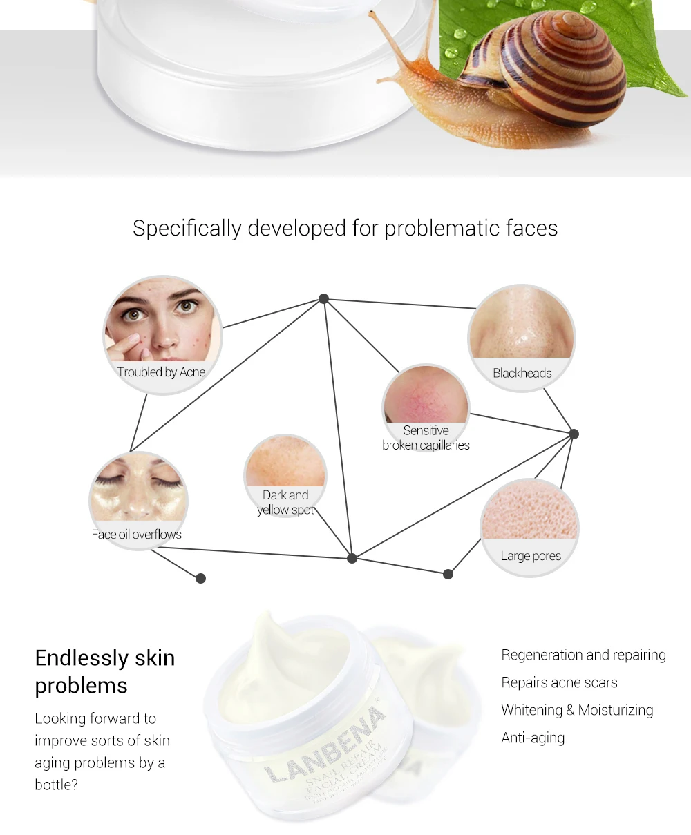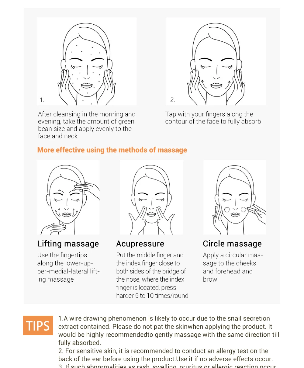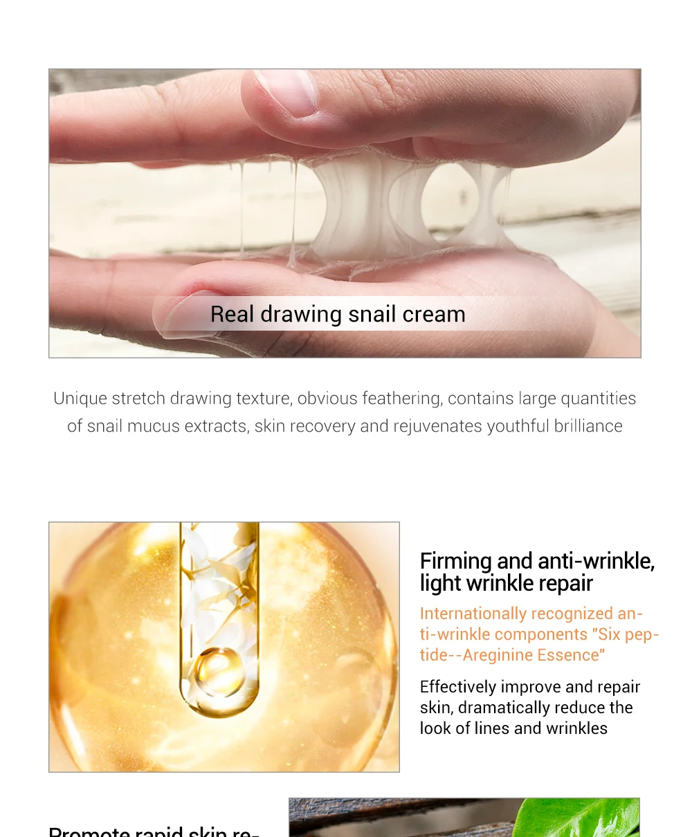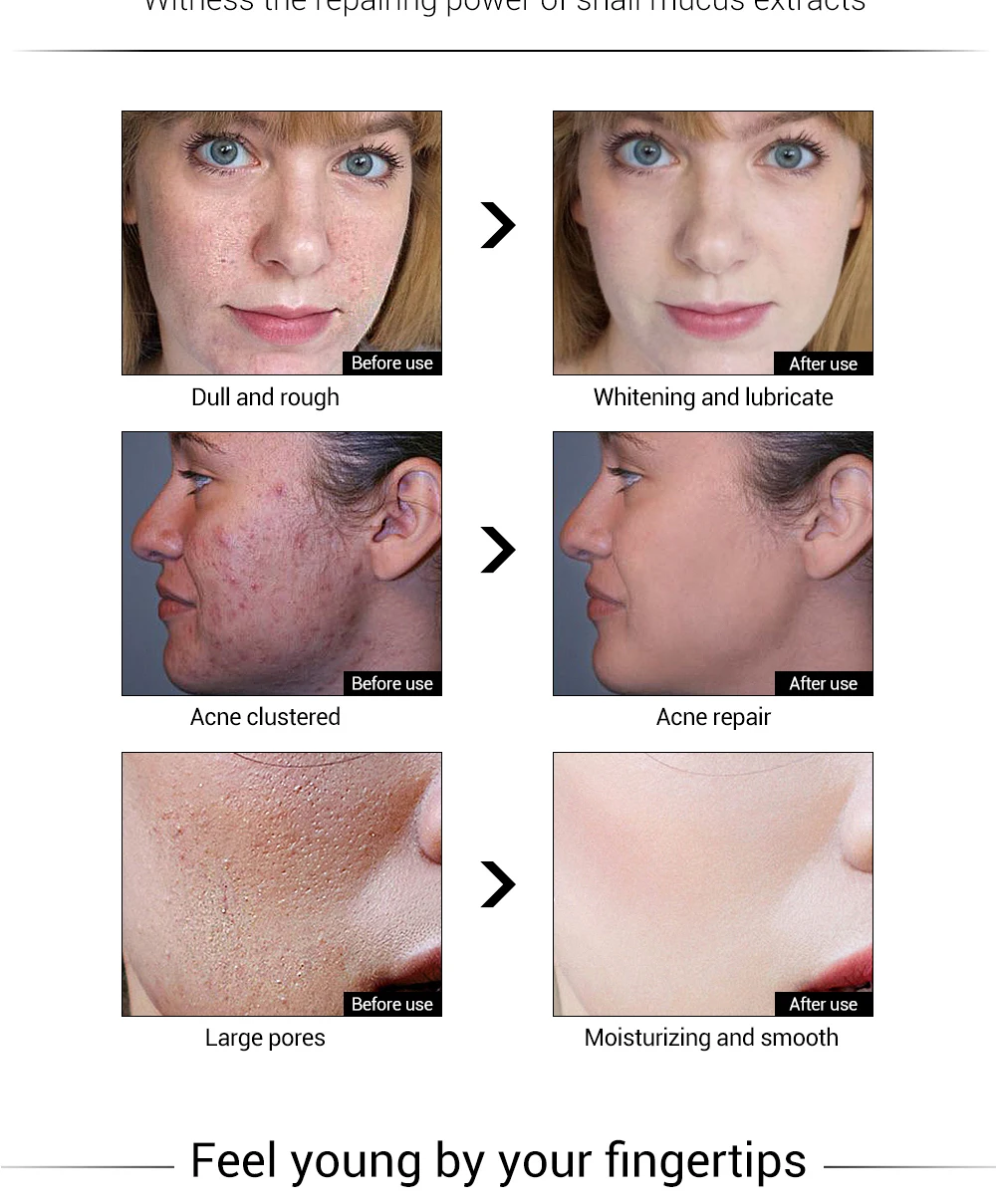 Помимо мощной функции регенерации и восстановления, улиточный крем особенно полезен для отбеливания кожи, увлажнения и ремонта. Увлажняя, она также может сделать вашу кожу регенерированной быстрее, утолить кожу натуральной эластичностью и коллагеном, мягко бороться с акне. между тем, он эффективно восстанавливает шрамы от акне, подтягивает поры и обеспечивает антивозрастной эффект.