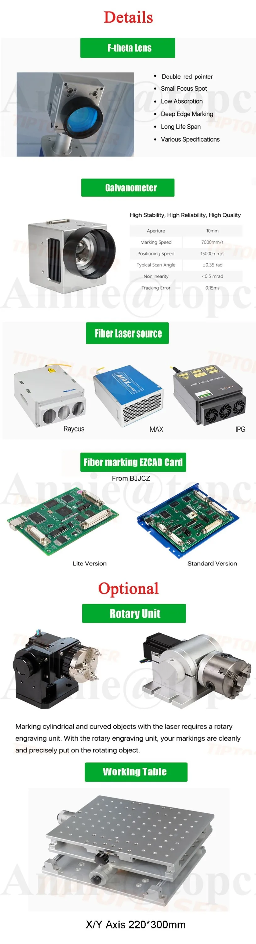 Модель Лазерный источник Мощность лазера Длина волны Область маркировки Частота повторения лазера Скорость маркировки Качество луча Глубина маркировки Точность работы Минимальная ширина линии Минимальный символ Стиль охлаждения Срок службы лазерного модуля Программное обеспечение управления Поддерживаемый формат Рабочее напряжение Упаковка Размер упаковки Вес брутто | TPW-20W Рейкус 20 Вт, 30 Вт, 50 Вт, 60 Вт 1064 нм 110*110 мм, 175*175 мм, 300*300 мм (опционально) 20 кГц-80 кГц 7000 мм/сек М²: 1,5 0,01-1 мм 0,001 мм 0,017 мм 0,2 мм Воздушное охлаждение Более 100000 часов EZCAD PLT, DXF, DST, AI, SDT, BMP, JPG, JPEG, GIF, TGA, PNG, TIF, TIFF,CAD, CDR AC 220 В/50 Гц Прочная деревянная коробка 840*450*750 мм 63 кг |