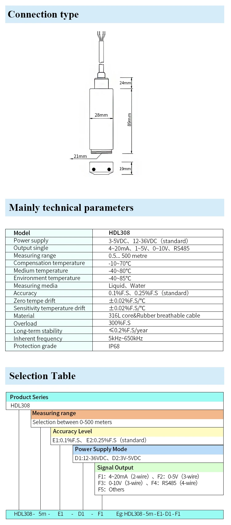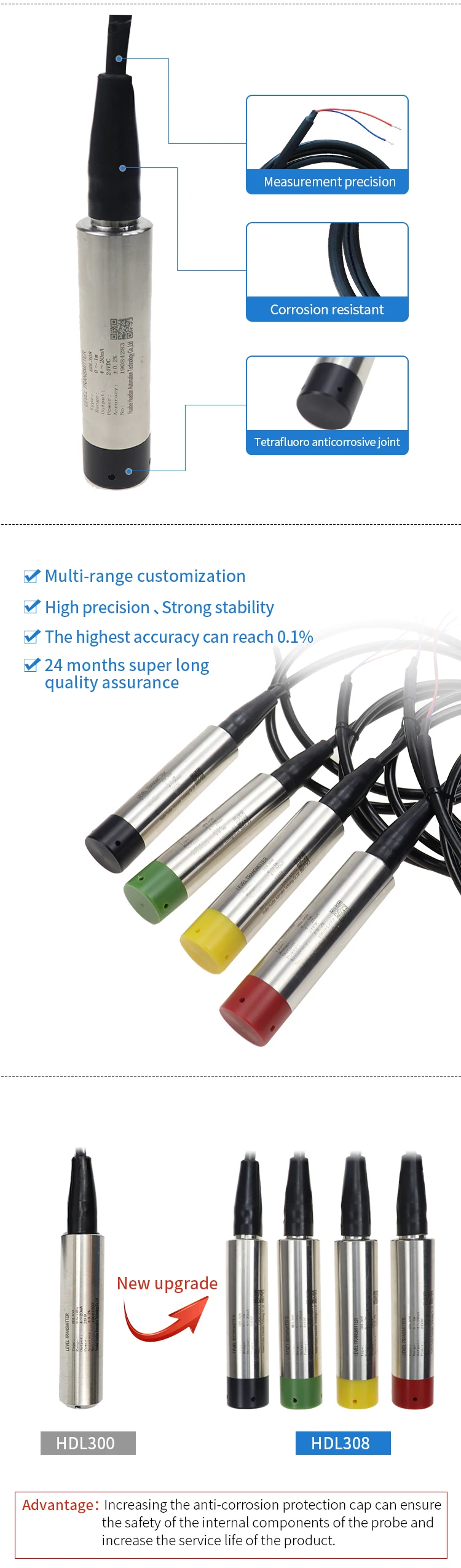 HDL308Серия0 5v Гидростатический Датчик Уровня ЖидкостиЧувствительный к давлению сердечник принимает высокопроизводительный силиконовый Пьезорезистивный наполнительный сердечник. Внутренний ASIC преобразует сигнал милливольта датчика в стандартный сигнал напряжения, тока или частоты, который может быть непосредственно подключен к Интерфейсной карте компьютера, инструменту управления, интеллектуальному инструменту или ПЛК. Увеличение защиты от коррозии колпачок может обеспечить безопасность внутренних компонентов зонда и увеличить срок службы продукта. Он имеет небольшой объем, светильник вес, все нержавеющая сталь конструкция уплотнения и может работать в агрессивной среде. Продукт прост в установке и обладает высокой антивибрацией и ударопрочностью. Он широко используется в управлении процессом, авиации, аэрокосмической, автомобильной, медицинской техники, ОВКВ и других областях.