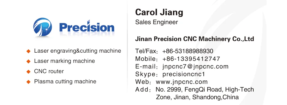 Jinan Precision CNC Machinery CO.,LTD-это коллекция исследований и разработок, дизайна, производства оборудования с ЧПУ, которое специализируется на различных рекламных станках с ЧПУ, деревообрабатывающих станках с ЧПУ, фрезерных станках с ЧПУ, лазерной гравировке и резке, станках лазерной маркировки. Наша продукция экспортируется в более чем 40 стран Европы, Ближнего Востока, Африки, Азии, они хорошо приветствуются и завоевали доверие и удовлетворение клиентов. Мы учимся на зарубежных передовых технологиях, принимаем Импортные высококачественные запасные части для гарантии качества машины. Наши продукты имеют сертификаты CE FDA.
