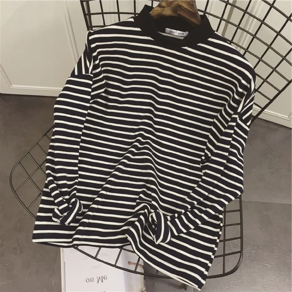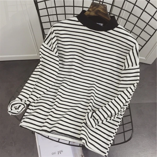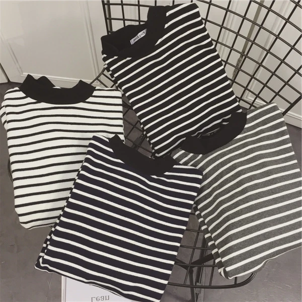 Корейские полосатые футболки женские 2019 осенние водолазки с длинным рукавом