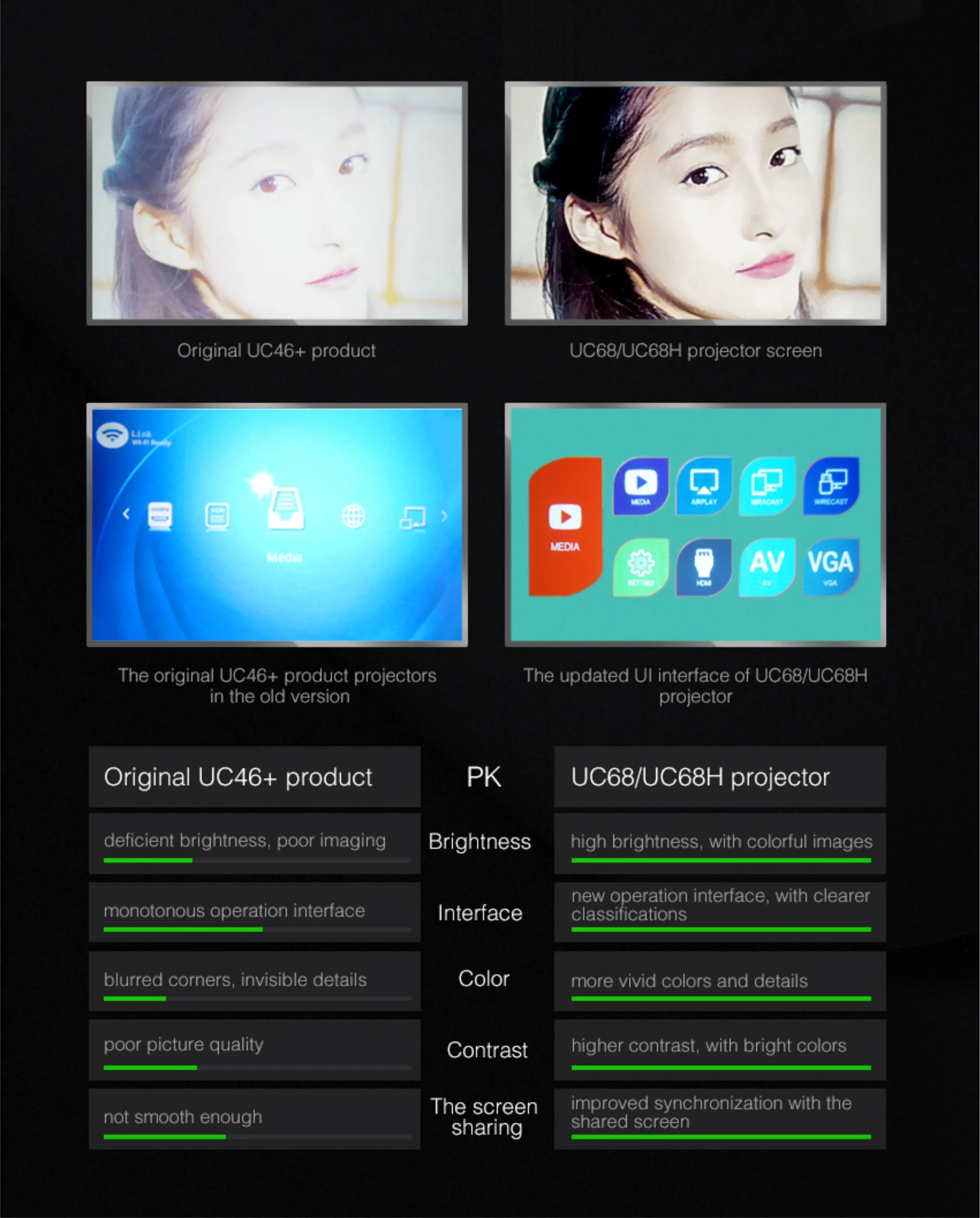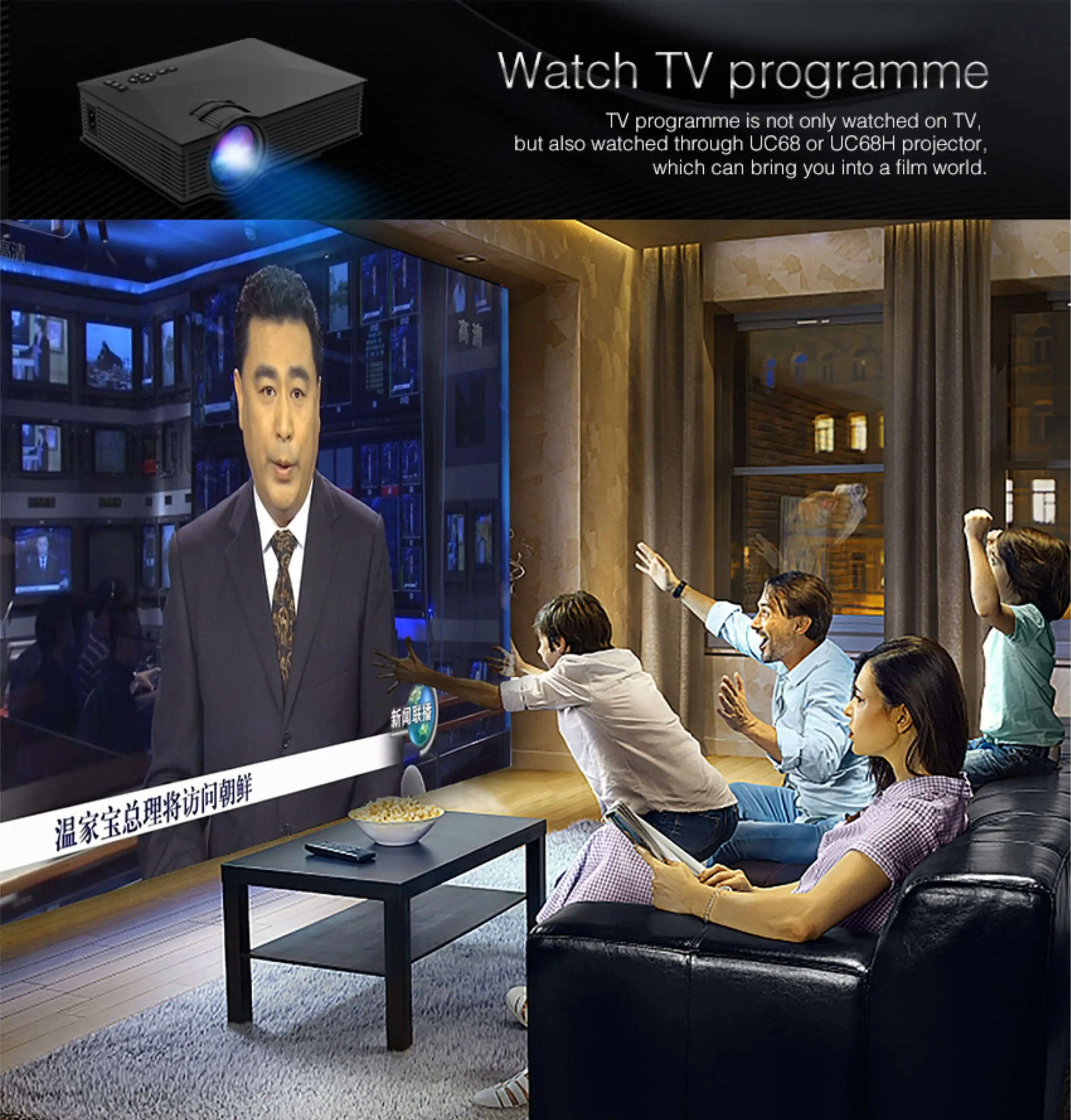 Разрешение:800*480, поддержка 1080p, 720p, 480p3D: Поддержка красного и синего 3DКонтраст: 800:1Срок службы и Тип лампы:Светодиодный светильник,Более 20 000 часов.Соотношение сторон:4:3/16:9Эффективность свечения светодиодный: ~ 90%ПроекцияРазмер проекционного чертежа: 37-115 дюймовРасстояние просмотра:1,07 ~ 3,8 мРазмер проекции:34 ~ 130 дюймаКоррекция трапецеидального камня: ± 15 градусовУправление:РуководствоИнтерфейс:AV, SD-карта, аудиовыход 3,5 мм, HD-порт, USB, выход 5 В, VGAМощностьПотребляемая мощность: 55 Вт (макс.)USB-выход: 5 В-500 мАИсточник питания: 100 В ~ 240 В/0,9 А (макс.) ГцМультимедийный формат USBФорматы Видео: 3GP (H263.MPEG) / AVI (XVID H264) / MKV (XVID H264.DIVX) /FLV (FLV1) / MOV (H264) / MP4 (MPEG-4. AVC) / MPG (MPEG1) / VOB (MPEG2) /MPG (MPG-PS) / RMVB (RV40)Форматы изображений: JPEG / BMP / PNGАудиоформаты: MP3 / WMA / ASF / OGG / AAC / WAVДругая функцияНомер модели:UC68С USB, AV, HD-портом, VGA,SD-интерфейсомВсе новые форматы поддерживают воспроизведение, с максимальным разрешениемИз1920*1080Этот мини-проектор подходит только для домашних киноразвлечений.Не подходит для офисного обученияЭтот проектор может быть проводным и беспроводным подключением для реализацииТа же функция экрана Мобильный телефонВы можете плавать в больших фильмах и наслаждаться всеми видеоЧто находится в коробке?1X HD проектор1X адаптер1X пульт дистанционного управления1X AV-кабель1X руководствоДисплей изображенияСмотрите так же другие товары: