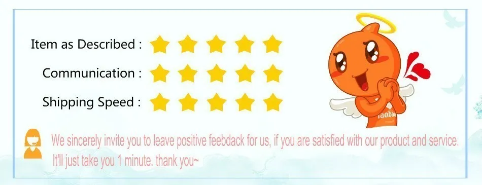Мы Оцените ваш бизнес, если вы удовлетворены нашей продукцией, пожалуйста, оставьте нам 5 звезд отзывы. Если есть какие-либо проблемы с заказом, мы всегда приложим все усилия, чтобы вы были довольны заказом. Спасибо!