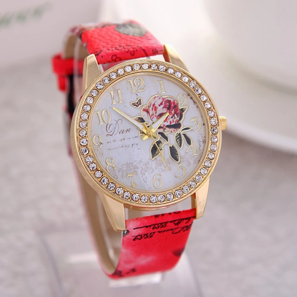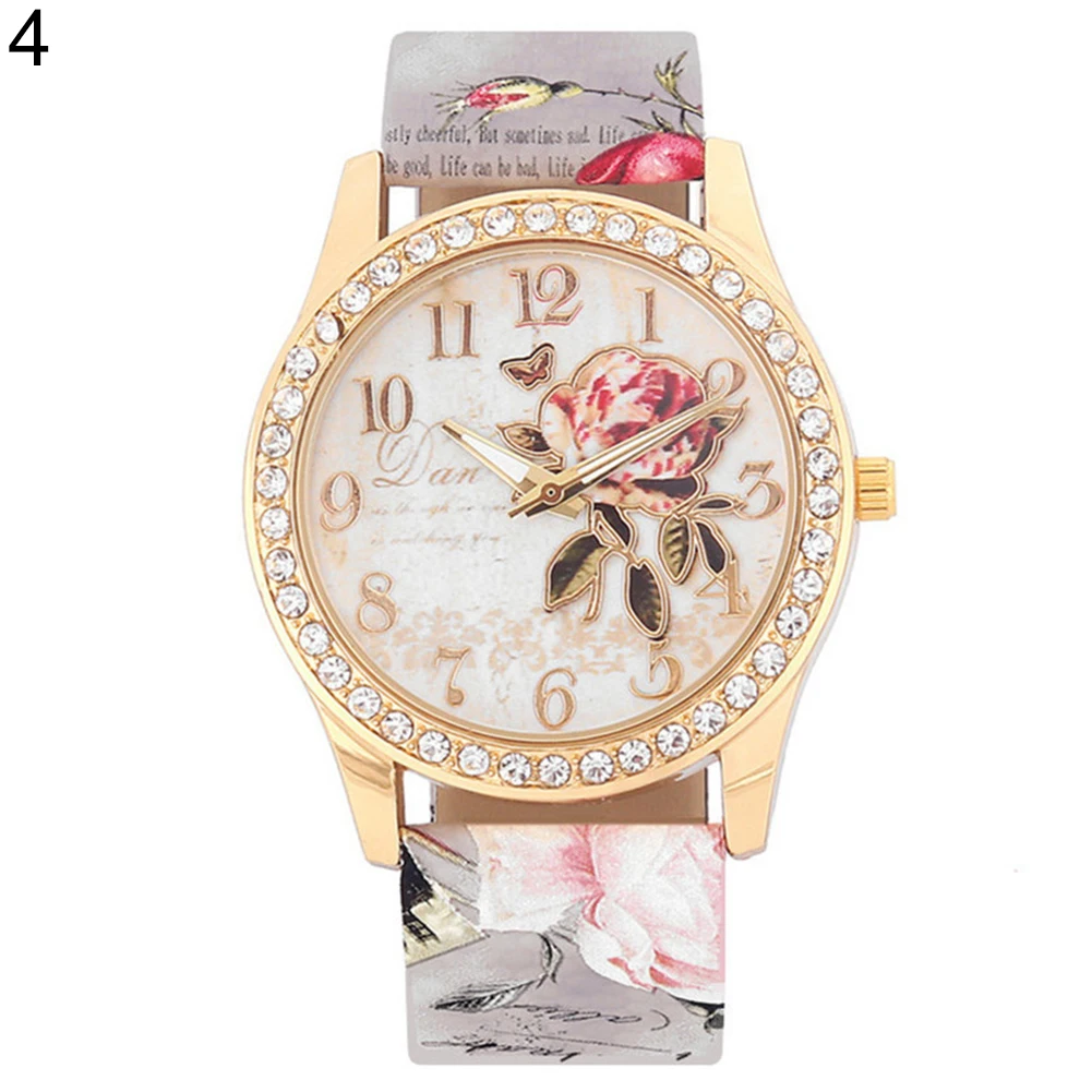 Модные женские печатные розы шаблон горный хрусталь наручные часы повседневные кварцевые наручные часы