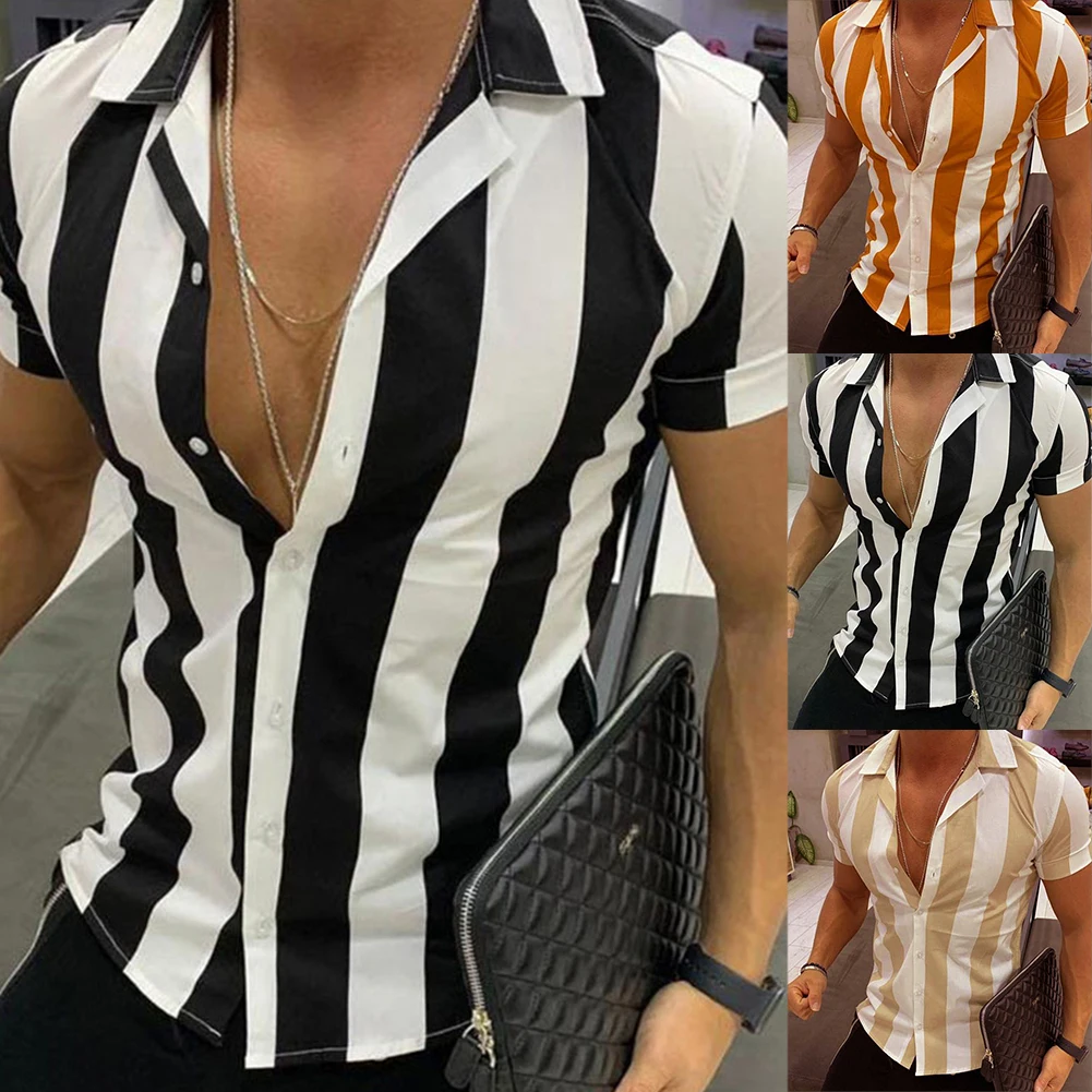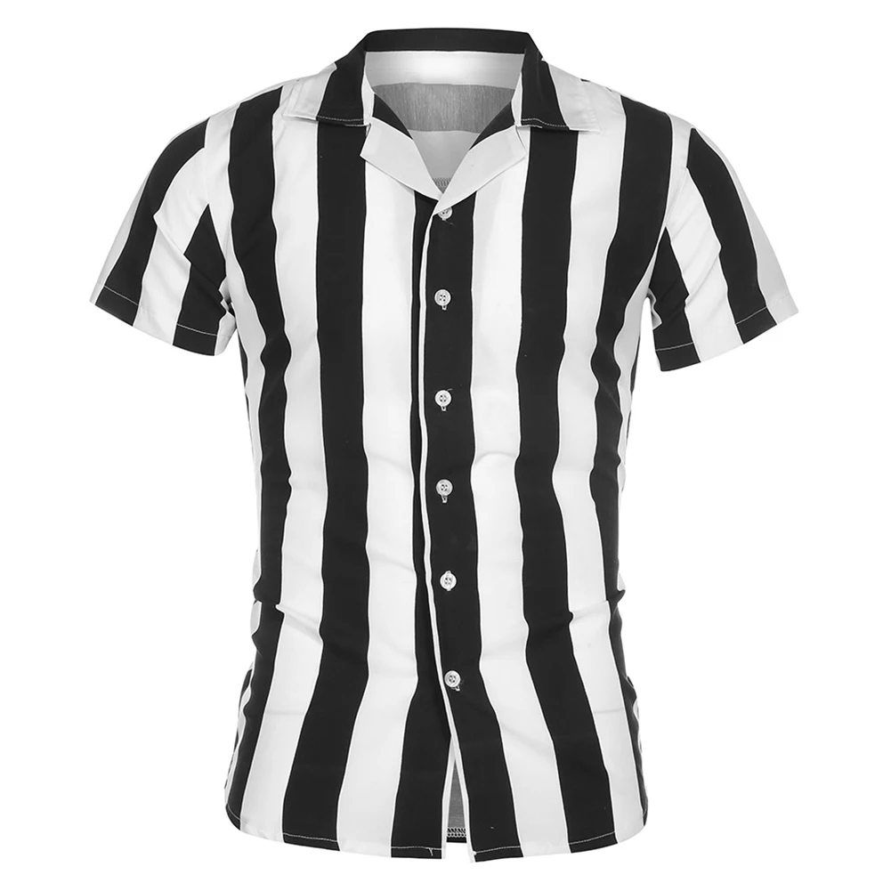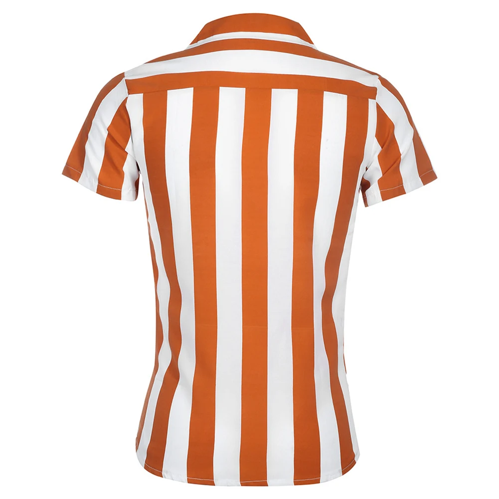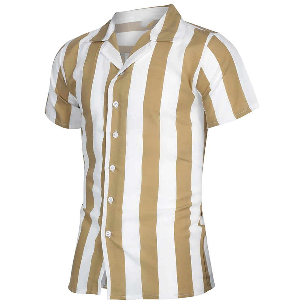 Casual Striped Print Shirt Top Men Button Turn Down Collar Short Sleeve Blouse