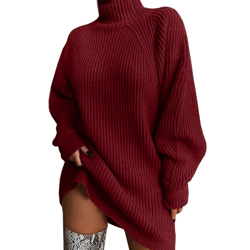 Женский Теплый свитер с высоким воротником, длинный рукав реглан, вязаный свитер, свободное миди-платье, женская одежда на зиму