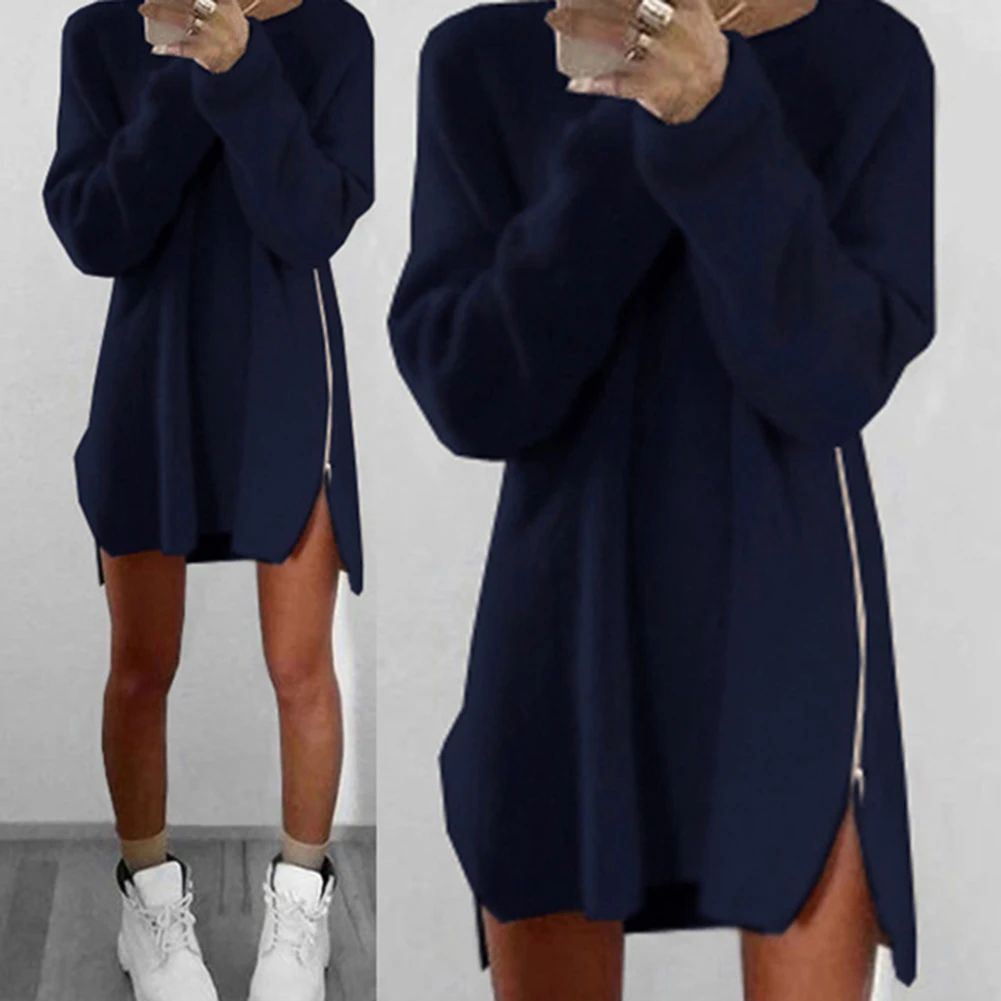 Women Sexy Solid Color Long Sleeve O Neck Sideway Zip Loose Mini Sweater Dress
