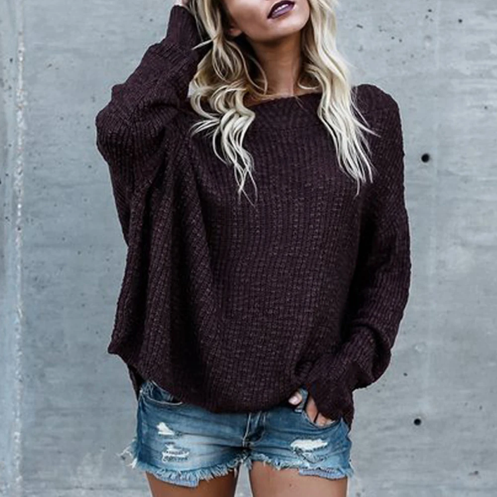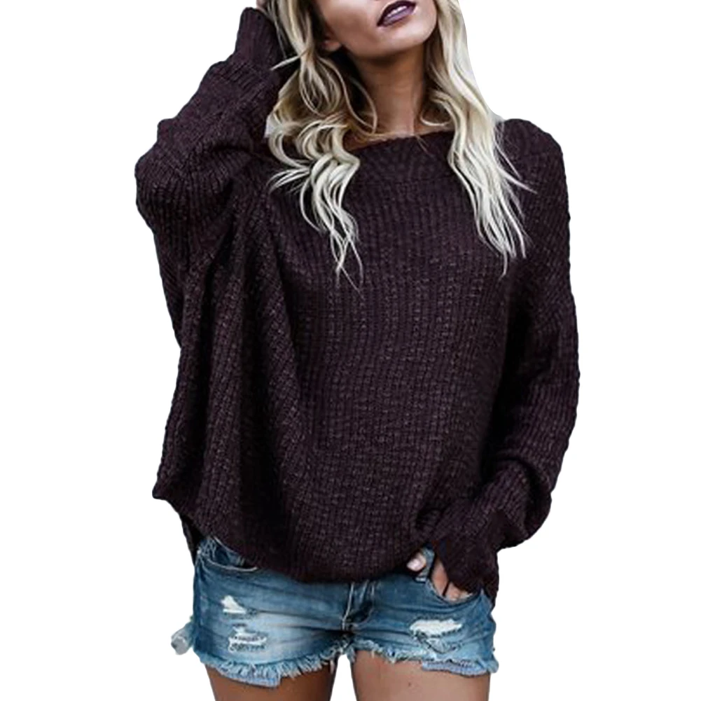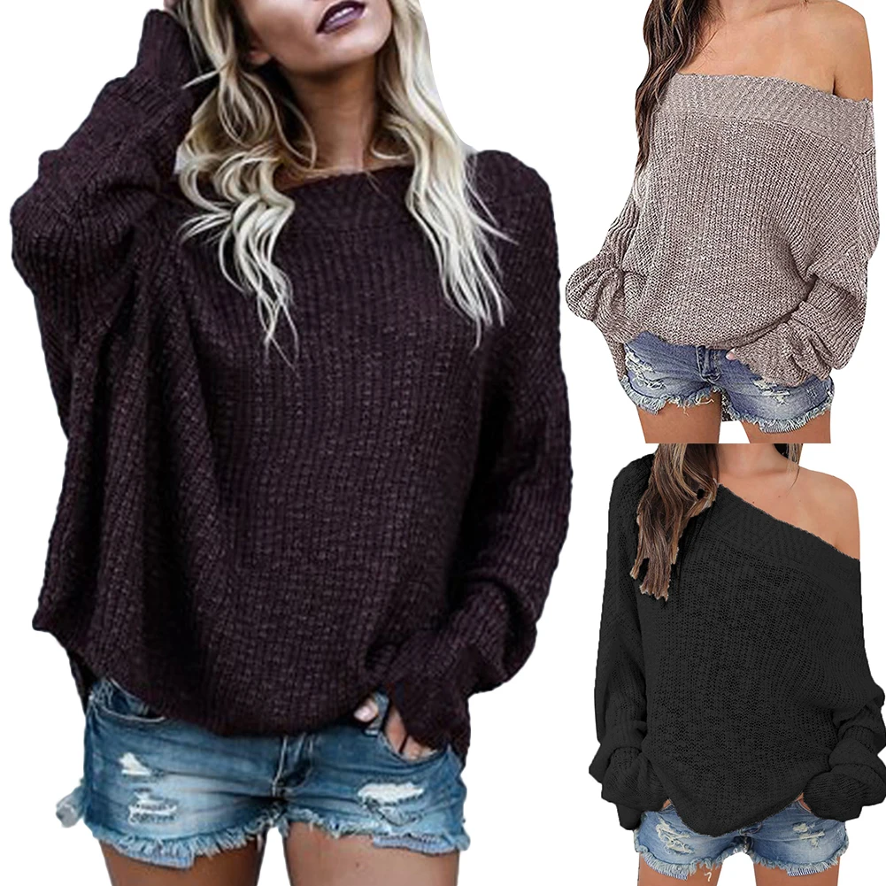 Женский осенне-зимний однотонный вязаный свободный свитер с длинным рукавом и открытыми плечами