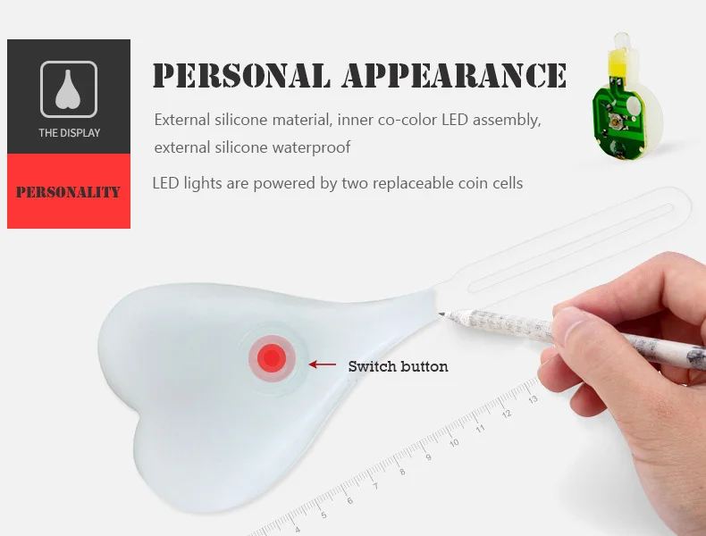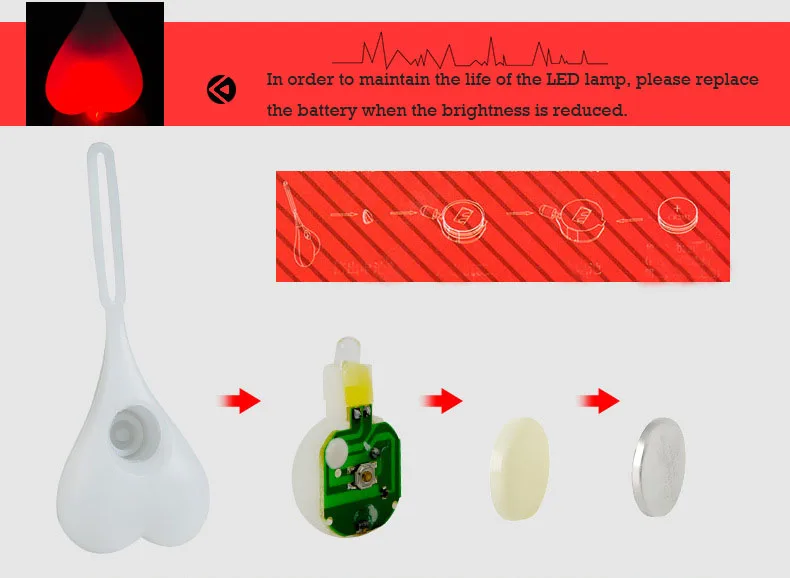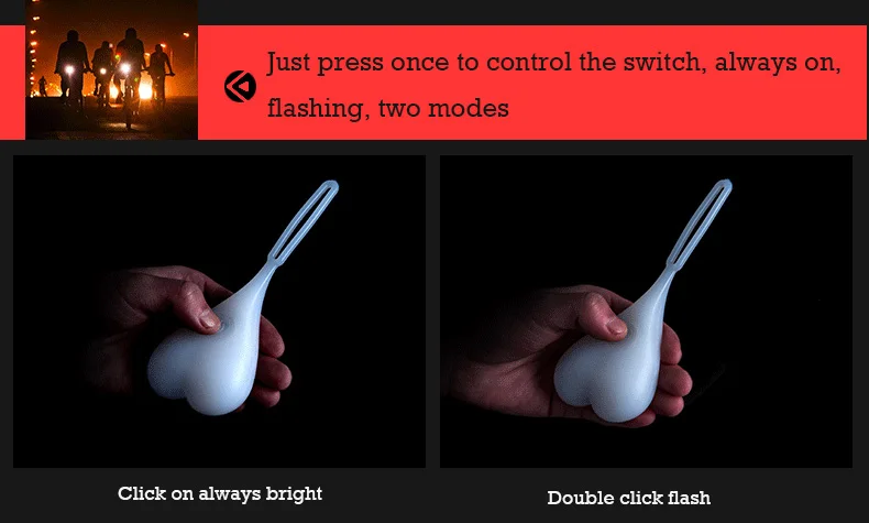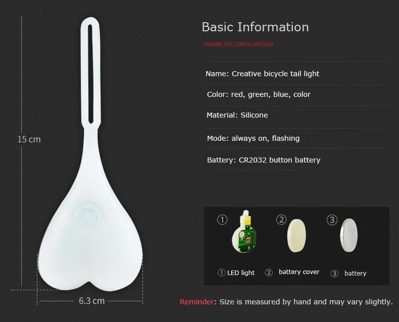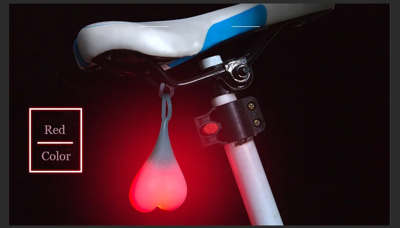 Features: Super flexible rubber Battery equipment Power switch button ute heart design Waterproof material 3 flashmodes Specifications: Model No.: HW50413 Brand New and High Quality Material: silicon Item Color: white LED Color: red/Blue/Green/Changeable Size: 14.5*6*3 cm Battery: 2 * CR2032 (Not Included) 3 Mode: bright/Quick flash/Low flash Package codes: 1 * Egg Bicycle light Note: Dear Friend, welcome to our Store, Please read this message before buying. thanks! 1. if you are a Russian customer, please tell us your full name after you pay, then we can send the goods faster. 2. before buying, please don ignore the color, the size, and the number. we hope our customer can get the things they love. 3. if you have any other requirements, please leave us a message, we will try our best to serve you. ^-^