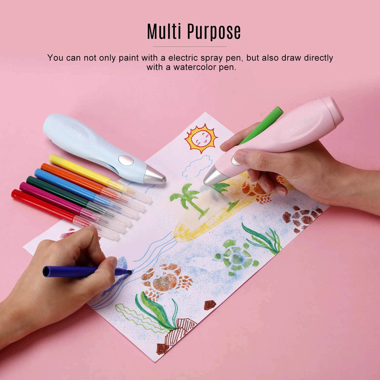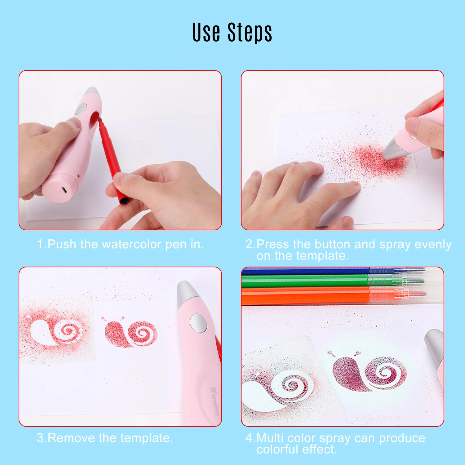 【Многоцелевой 】:Вы можете рисовать не только электрической ручкой-распылителем, но и рисовать непосредственно с помощью ручки. Развивайте способность детей распознавать и сочетать цвета.