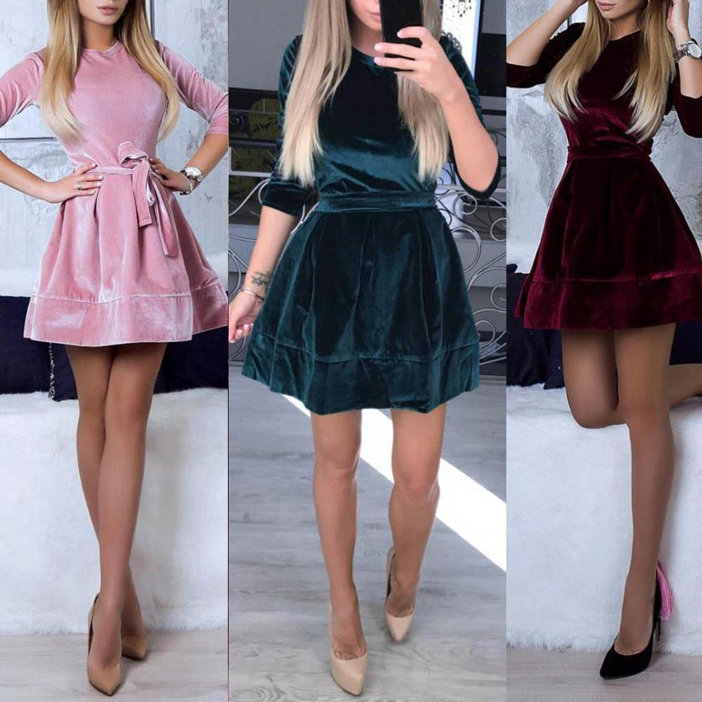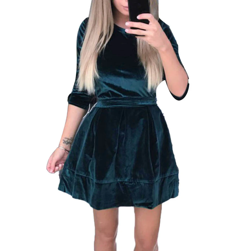 Шикарный женский сплошной цвет о-образный вырез с длинным рукавом бархатный пояс большие качели мини-платье