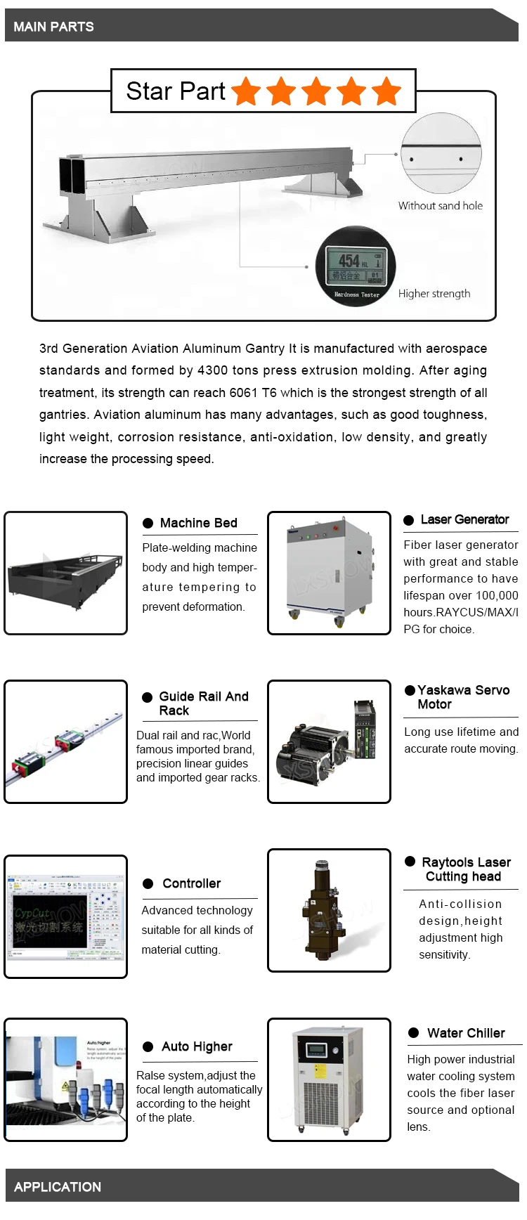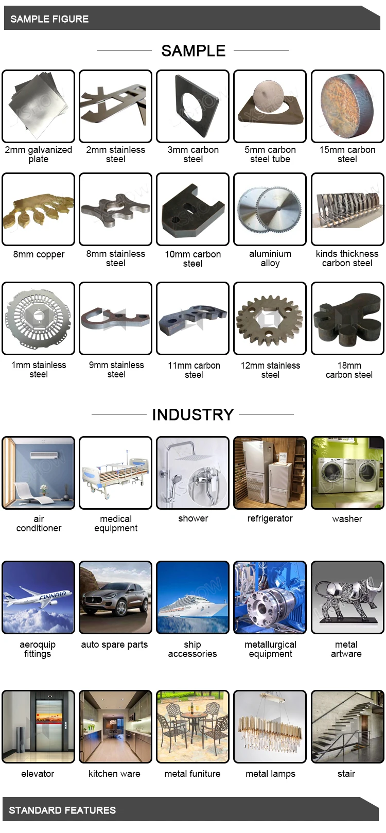 Применяется в обработке листового металла, авиации, космическом пространстве, электронике, электроприборах, детали метро, автомобилях, машинах, точных компонентах, кораблях, металлургическом оборудовании, лифте, бытовой технике, подарках и ремеслах, обработка инструментов, украшение, реклама, Иностранная обработка металла различные обрабатывающие отрасли производства.