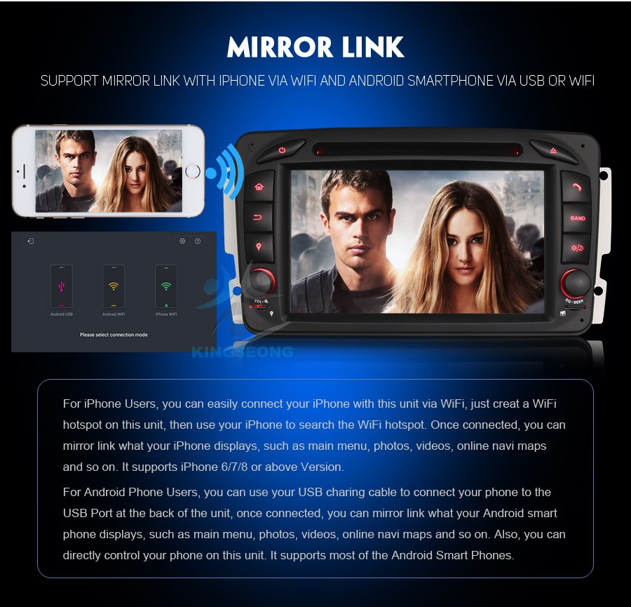 -Поддержка функции зеркальной связи: Да, поддержка зеркального отображения экрана с iphone и Android смартфона