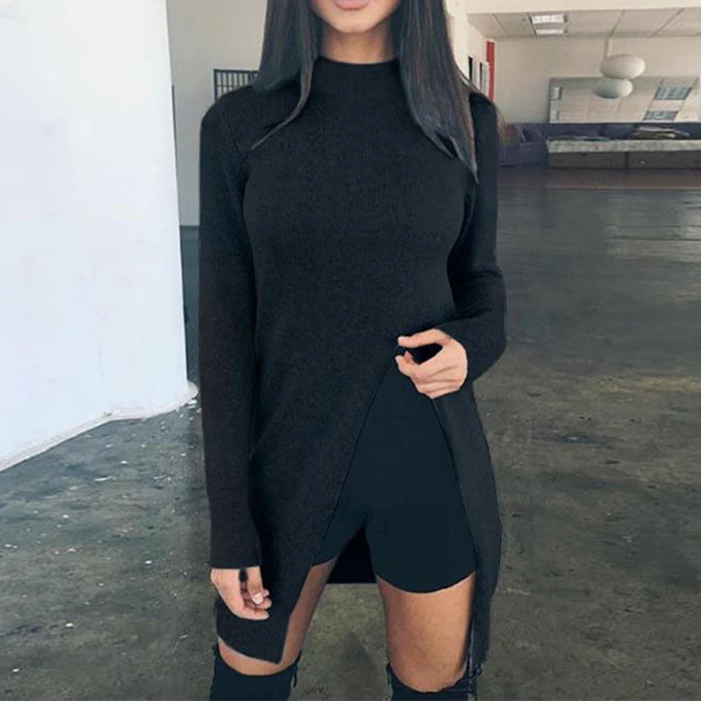 Шикарный женский однотонный топ с длинным рукавом и круглым вырезом, с высоким Боковым Разрезом, свободная футболка средней длины