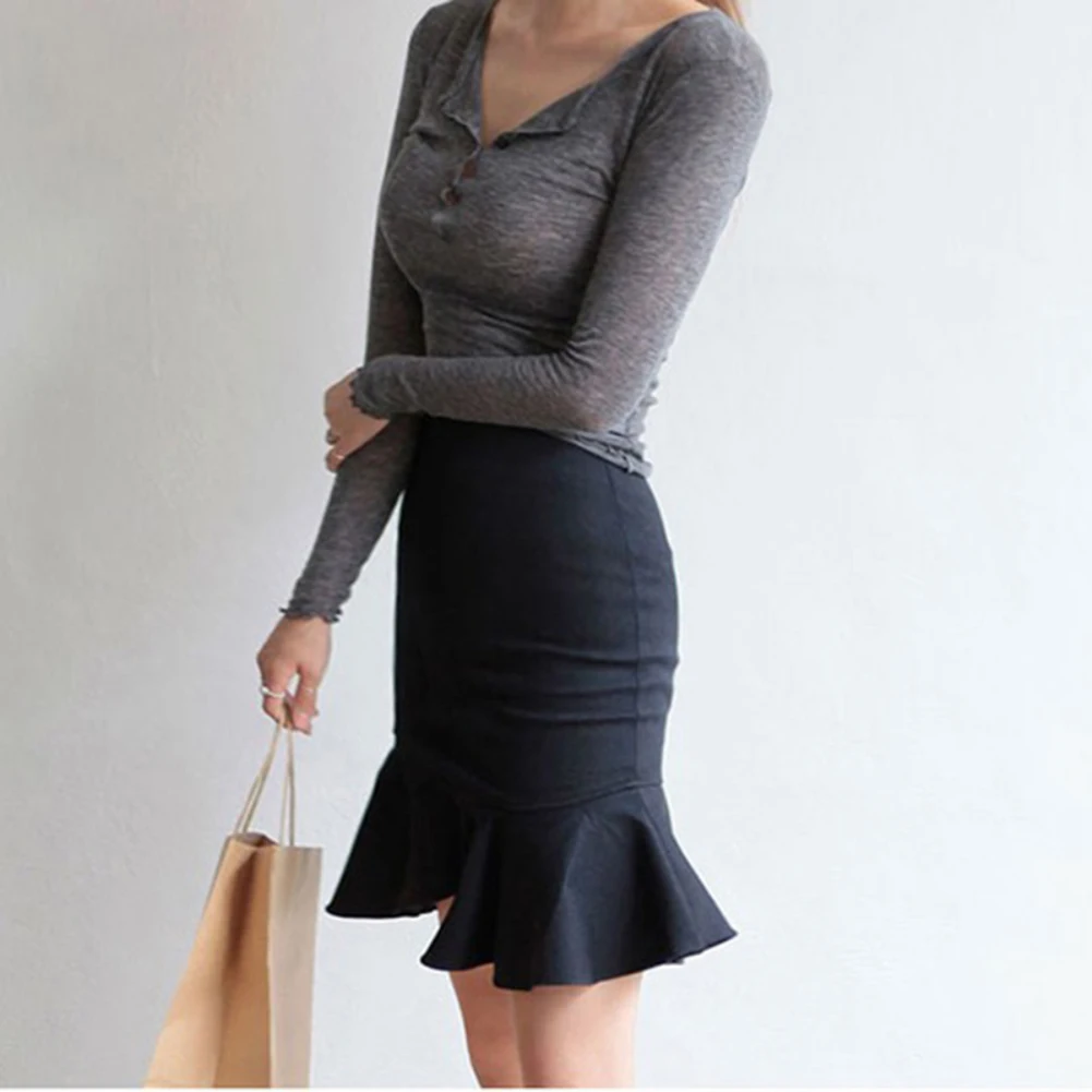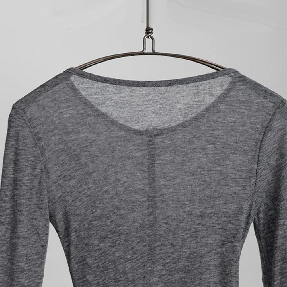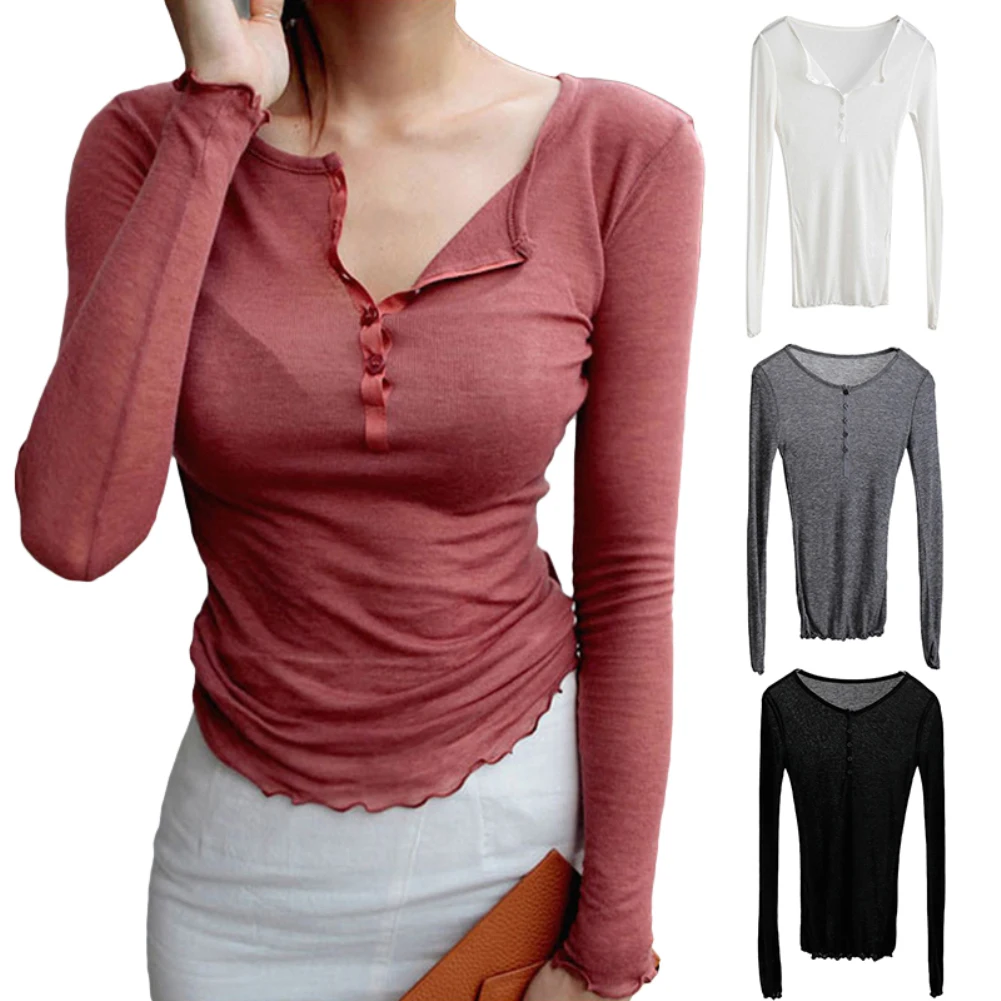 Women Casual Solid Color Long Sleeve Buttons V Neck Slim Cotton Blouse Shirt