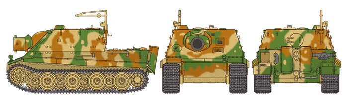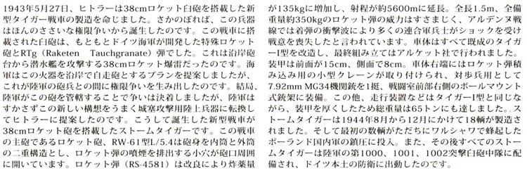 【 38cm ロケット砲を備えた猛虎 】タイガーi戦車の車体に 38cm ロケット砲を搭載し 、 要塞攻撃用の車輌として第二次大戦末期に登場したのがドイツ軍のストームタイガーです 。 前面 15 см в надутом виде 側面 8cm の重装甲を誇る戦闘室に 、 長さ 1,5 м 、 重量約 350kg のロケット弾を発射する巨大な主砲を装備 。 戦場から後送されたタイガーiの車体を改造し 、 1944 года 8 月から 12 月までに 18 輌が生産されました 。 最初の数輌はワルシャワで蜂起したポーランド国内軍の鎮圧に投入され 、 その後もドイツ本土で終戦まで戦ったのです 。 |