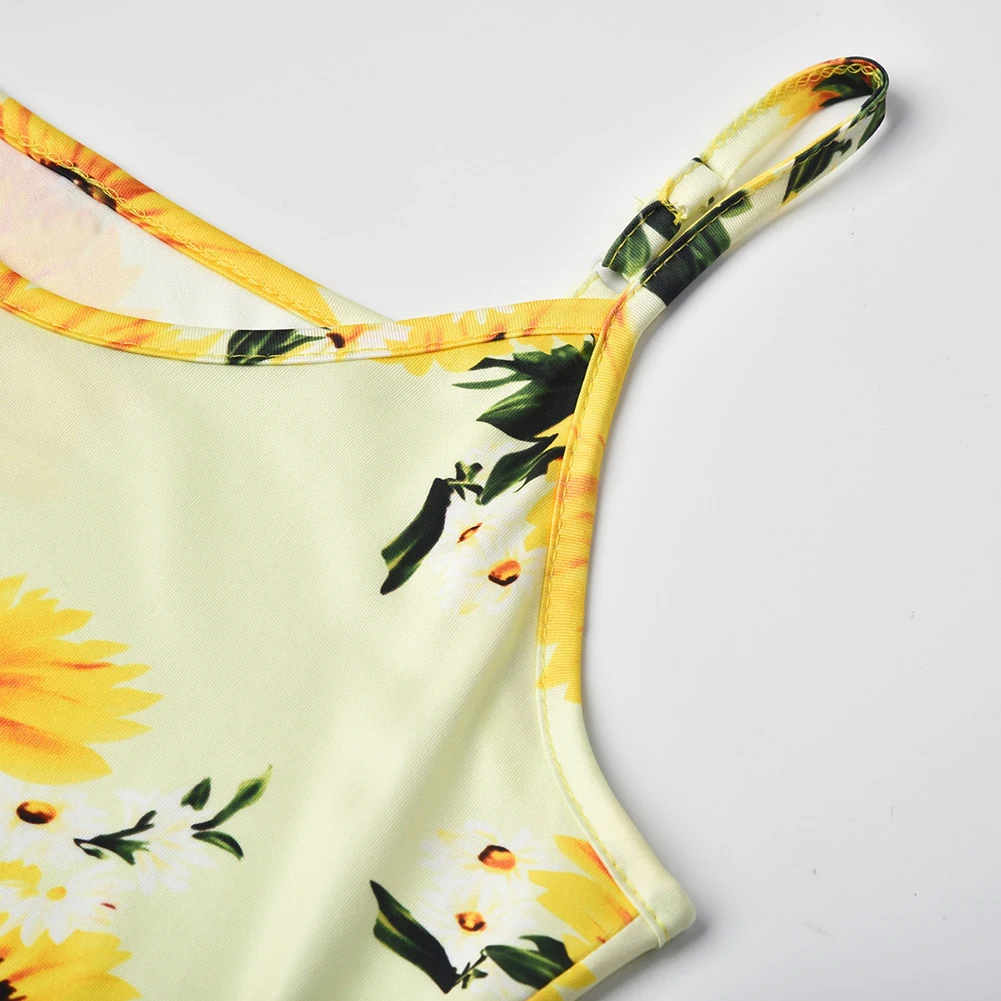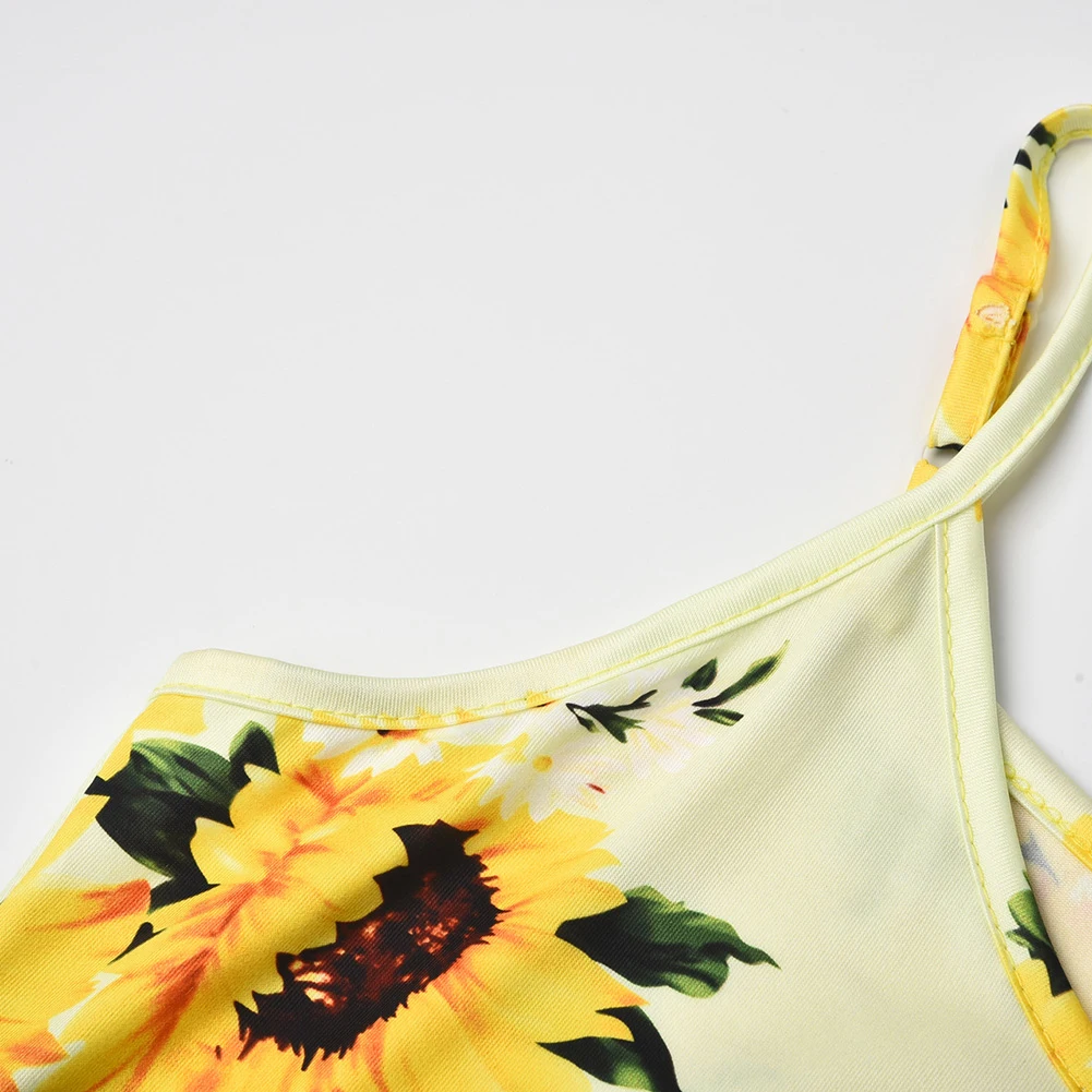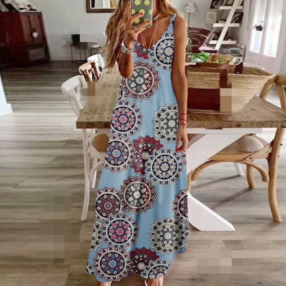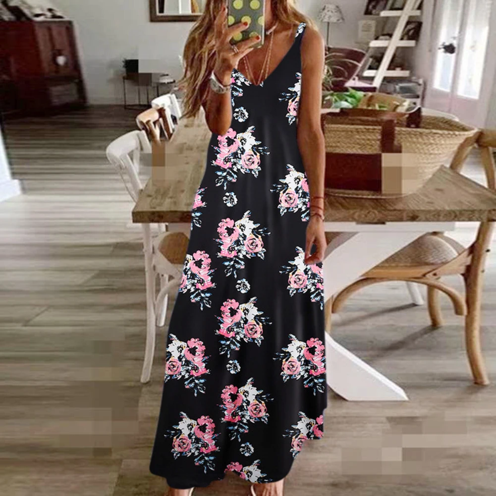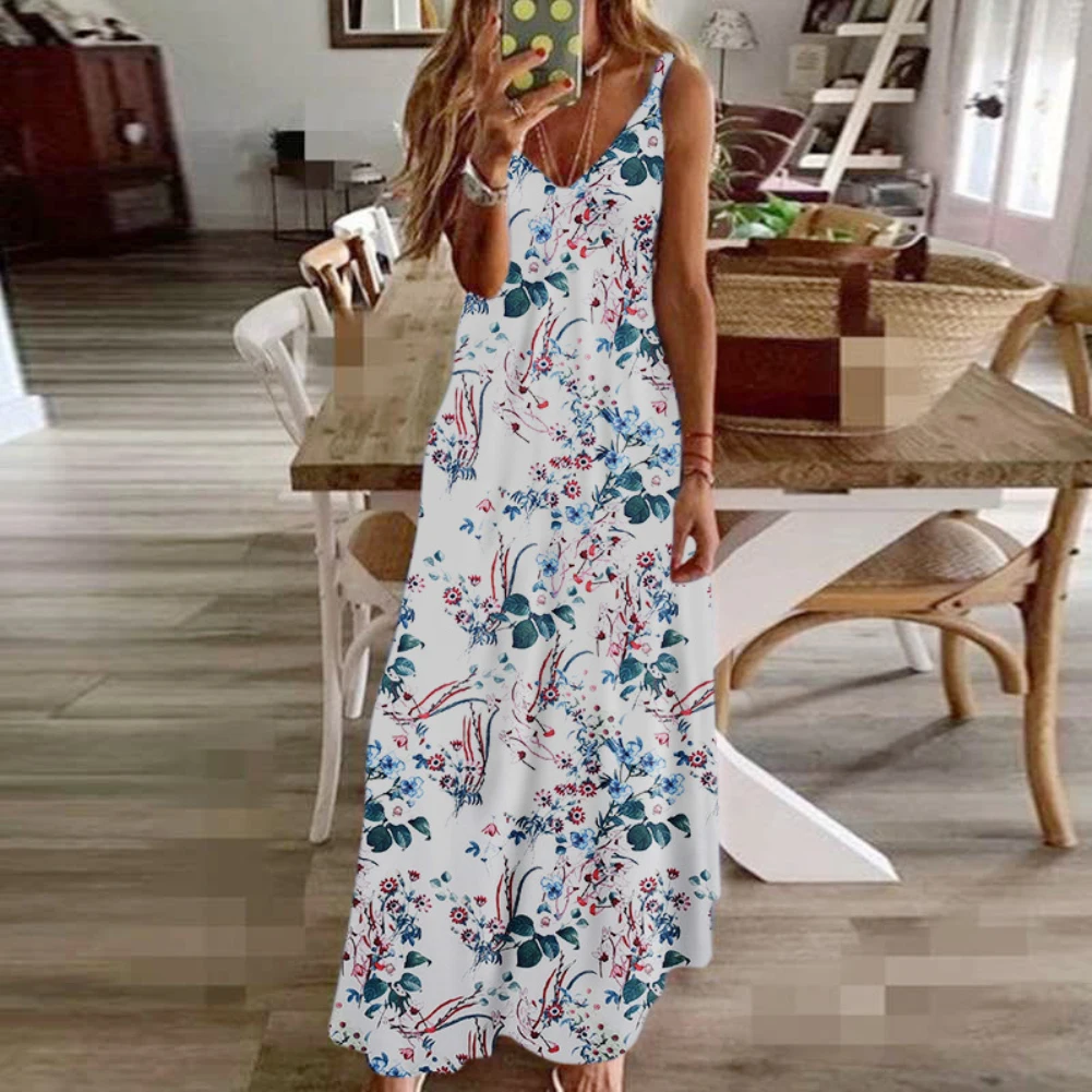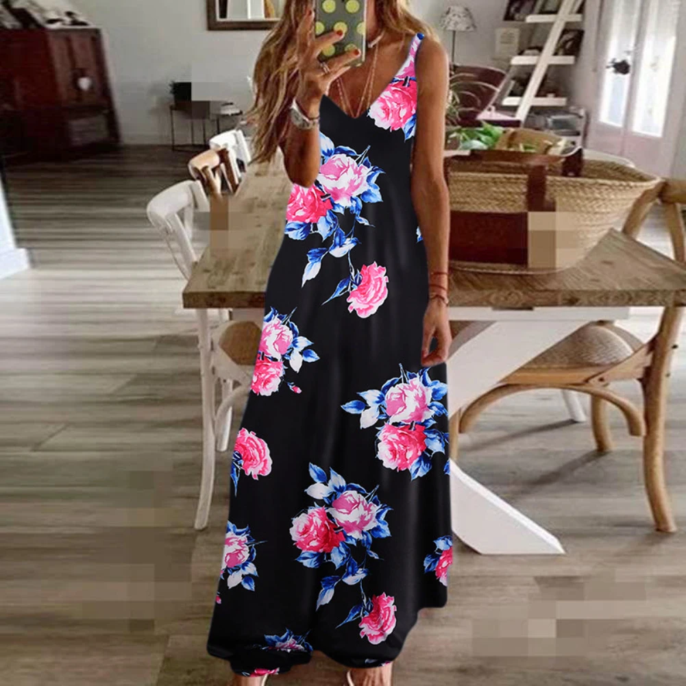 Women V Neck Adjustable Straps Chrysanthemum Print Large Hem Long Sling Dress