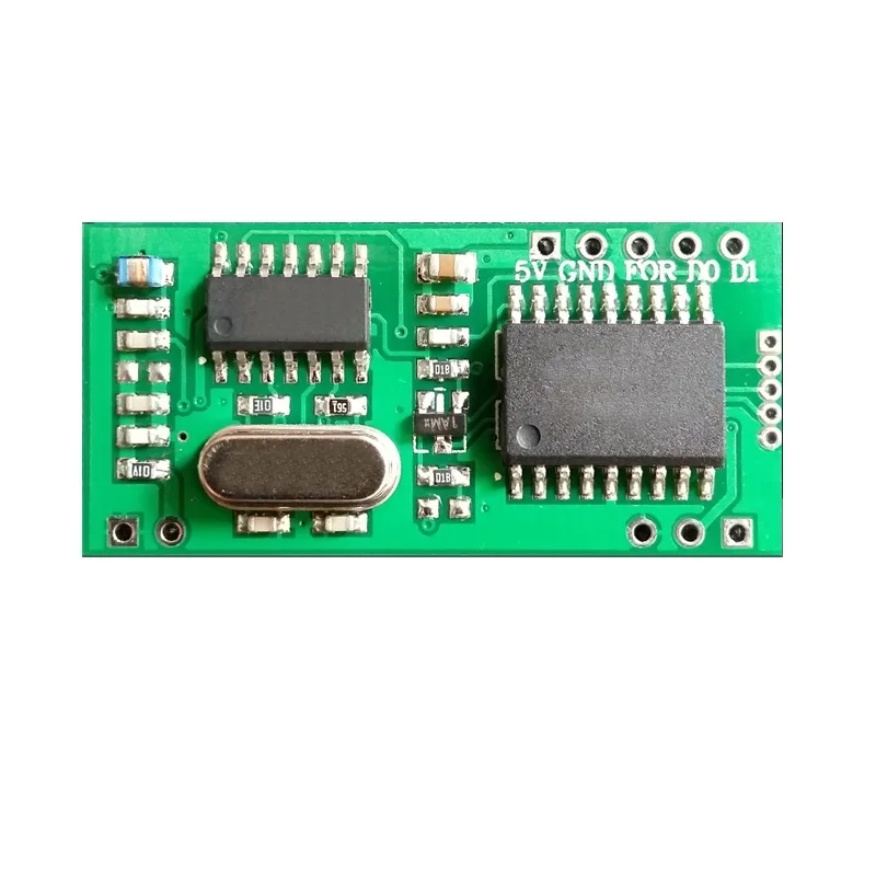 Интерфейс Описание:1>.VCC: вход для положительного рабочего напряжения.2>.GND: вход для отрицательного рабочего напряжения.3>.D0: это TXD UART. Модуль просто может отправить данные.Примечание: у модуля только 3 кабеля. Он просто использует TXD UART. Протокол UART Введение: 1>. Заголовок протокола: 0x022>. Длина данных: 0x093>. Тип карты: 0x01 (больше см. Тип карты)4>. Данные карты: SN0 ~ SN35>. Проверка XOR: 1 байт. Результат проверки других байтов, за исключением заголовка протокола6>. Конец данных: 0x03 Пример: Если приемник данных 02 0A 02 2E 00 B6 D7 B5 F2 03.It-это значит, что:1>. Первый байт 0x02-это флаг запуска данных.2>. Второй байт 0x0A-Общая длина данных. Он включает старт и конец байта.3>. Третий байт 0x02 означает, что тип карты EM4100.4>. 4-8-й байт (0x2E 0x00 0xB6 0xD7 0xB5)-это номер карты. 4-й байт 0x2E-это скрытый номер карты.5>. 9-байтный 0xF2-это XOR контрольный байт.6>. 10-й байт-это конечный флаг данных. Применение: 1>. Посещаемости2>. Контроль доступа3>. Промышленный контрольСмотрите так же другие товары: