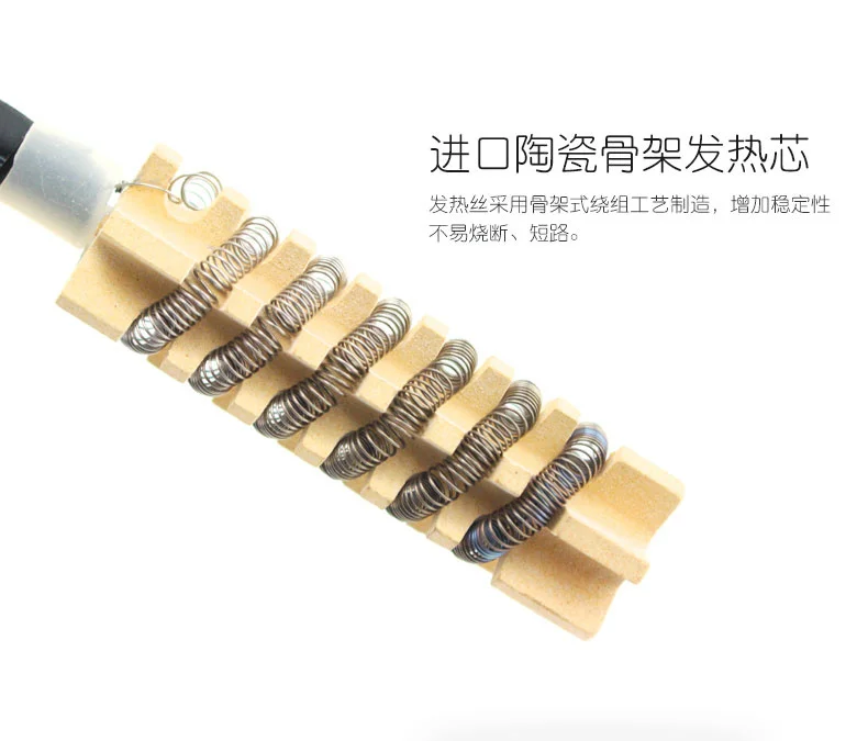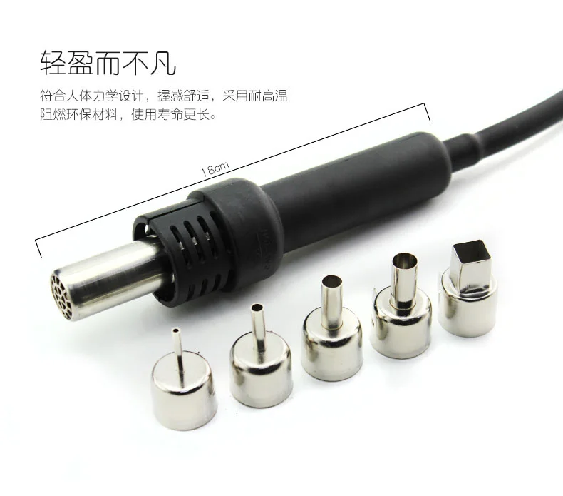 Он соответствует дизайну механики человеческого тела и имеет удобное сцепление. Он обладает высокой термостойкостью и огнезащитным материалом для защиты окружающей среды и имеет более длительный срок службы. Длина ручки 18 см. Модели сопла: 3 мм, 5 мм, 8 мм, 10 мм, 13x13 мм. Импортированная керамическая нагревательная проволока для каркаса изготавливается в процессе обмотки скелета, что повышает стабильность, не так просто сжечь и короткое замыкание.