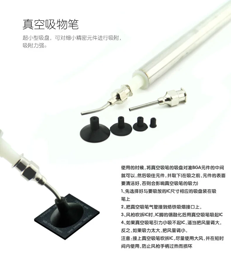 Ультра-маленькая присоска может адсорбировать тонкие и точные компоненты с сильным адсорбирующим силой 1. Выберите размер IC для присоски. 2. Подключите вакуумную всасывающую ручку trachea к интерфейсу для курения паяльника. warningConnect Вакуумная присоска для выдувания IC, используйте сильный ветер, насколько это возможно, и используйте его в короткое время, чтобы предотвратить перегрев и повреждение ручки воздушного пистолета.