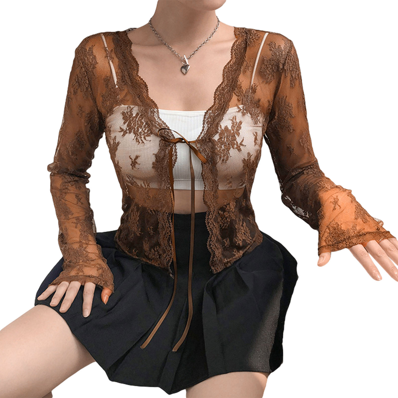 Женский сексуальный прозрачный короткий кардиган, повседневный короткий кардиган с длинными рукавами и цветочным кружевом